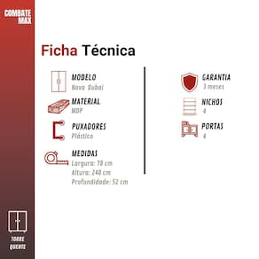 FICHA TÉCNICA DETALHADA: Produto: Torre Quente Modelo: Nova Dubai Marca: Casamia Referência: 3915 Material da Estrutura: MDF Acabamento: Touch Fosco UV Portas: 4 com abertura suave Prateleiras: 1 interna Puxadores: Alumínio com ponteira ABS Dobradiças: Slow Motion 35 mm Sistema de Montagem: Parafusos e cavilhas Necessita Montagem: Sim Garantia: 3 meses