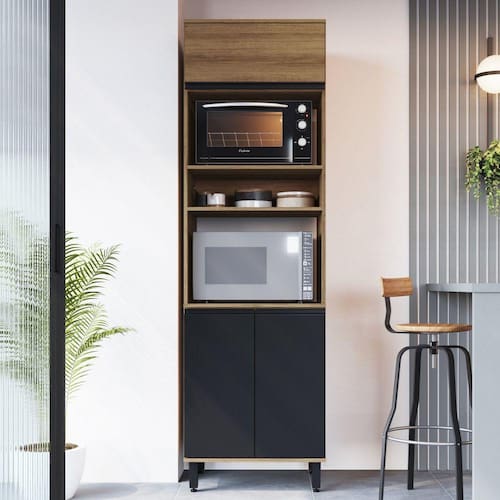 O Paneleiro Torre-Quente da Cozinha Modulada Laura possui espaço para forno e microondas contando com um design moderno, favorecendo a decoração do ambiente e evita um cômodo apertado, excelente qualidade de acabamento, estilo e personalidade em cada detalhe. Possui 2 nichos para forno elétrico ou forno micro-ondas e 3 portas com amplo espaço. Podendo ser utilizado sozinho ou pode compor a nossa Cozinha Laura Modulada. A Linha Laura é uma cozinha modulada repleta de estilo e personalidade, uma escolha inteligente para usar seu espaço. Não acompanha a decoração. Acabamento da Porta: Finish Foil Acabamento da Prateleira: Finish Foil Acabamento dos Pés: Polipropileno Altura dos Pés: 17 cm Ambiente Principal: Cozinha Complexidade da Montagem: Média: pode ser montado por mais de uma pessoa e/ou necessite de maior conhecimento para montagem Cor: Marrom/Preto Touch Cor do Produto: Marrom/Preto Touch Cor dos Pés: Preto Cor Flex: Não Cor Interna: Marrom Escala de Brilho: Fosco Escala de Brilho da Porta: Fosco Escala de Brilho da Prateleira: Fosco Informações Complementares: Itens Inclusos: 1 Paneleiro, Kit Ferragens e Manual de Montagem Linha ou Coleção: Laura Modulada Manual de Montagem e Instalação: https://cdn2.madeiramadeira.com.br/atributo/delmarco/950855-la1300-manual-de-montagem.pdf Material da Porta: MDP Material da Prateleira: MDP Material do Puxador da Porta: Plástico Material dos Pés: Plástico Montagem Flex: Não Necessita Montagem: Sim Origem do Produto: Nacional Pés Reguláveis: Sim Peso: 46,7 kg Peso Máximo por Prateleira: 5 kg Possui Espelho: Não Possui Possui Pés: 04 Possui Portas: 03 Possui Prateleiras: 03 Possui Rodízio: Não Recomendações de Uso, Manutenção e Limpeza: Para limpeza do móvel, use uma flanela seca ou umedecida. Não utilize produtos químicos que possam danificar o produto. Sapatas Niveladoras: Não Sistema de Montagem: Parafusos, cavilhas, minifix e pregos. Tipo de Dobradiça/Corrediça da Porta: Aço Tipo de Puxador da Porta: Externo