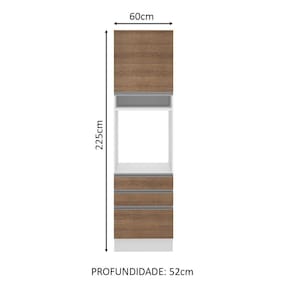 Sua altura é de armário planejado com 225 cm de altura e espaço para forno de 63 cm x 57 cm com abertura para saída do calor. Além disso possui um nicho decorativo para deixar itens do dia a dia mais a mão. Os pés são em PVC com regulagem de altura e rodapé removível de madeira de fácil encaixe. Este módulo precisa ser fixado na parede.