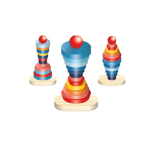 Contém 1 base medindo C 14cm x P 9,0cmx A 25cm e 12 peças em madeira coloridas em formato cilíndrico e cônico, com medidas diversas. Peças pintadas com tinta atóxica.