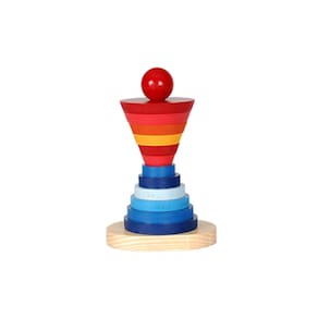 Contém 1 base medindo C 14cm x P 9,0cmx A 25cm e 12 peças em madeira coloridas em formato cilíndrico e cônico, com medidas diversas. Peças pintadas com tinta atóxica.