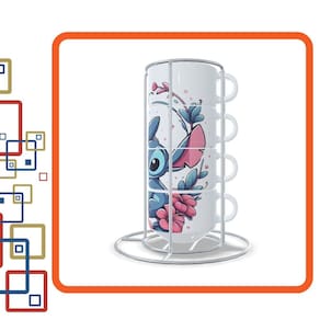 Torre Suporte de Metal com 4 Xícaras de Café 150ml - Estampa Mosaico Stitch Dê um toque especial aos seus momentos de café com este lindo conjunto de 4 xícaras de 150ml, acompanhadas de um suporte metálico elegante e compacto. Com uma estampa vibrante de Mosaico Stitch, este kit é perfeito para quem ama um design diferenciado e funcionalidade no dia a dia.