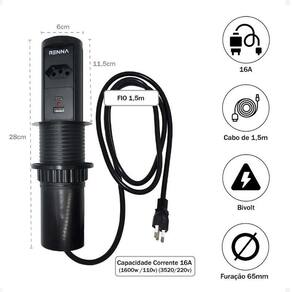 Torre Tomada Automática Indução Wireless 1 Tom 2 USB Preta Torre de Tomada Renna com Carregamento Wireless e Elevação Automática A Torre de Tomada Renna é a solução perfeita para quem busca praticidade e tecnologia no dia a dia. Com seu sistema automático de elevação, ela se esconde quando não está em uso, mantendo o ambiente moderno e organizado. No topo, o carregador por indução permite recarregar seu celular sem fios, oferecendo mais conforto e eficiência. Além disso, conta com 1 tomada elétrica, 1 entrada USB tradicional e 1 tipo C, garantindo compatibilidade com diversos dispositivos. Transforme sua bancada em um espaço moderno e funcional com a Torre de Tomada Renna. Com design sofisticado e tecnologia de ponta, ela sobe automaticamente com um simples toque, oferecendo praticidade e estilo para cozinhas, escritórios e áreas gourmet. Carregamento por Indução Wireless : basta apoiar o celular para recarregar sem fios. Conexões Completas: 1 tomada elétrica + 2 USB 1 tradicional e 1 tipo C . Sistema Automático de Elevação: sobe e desce com um simples toque. Design Moderno e Embutido: mantém a bancada limpa e elegante. Fácil Instalação: ideal para cozinhas, escritórios e áreas gourmet. Comprimento Cabo - 1,5mt Push to Open Carregamento Wireless Segurança Inmetro Corrente Elétrica - 16A Corrente Elétrica USB - 2.1 A Furação 65mm Usb A/C Material: alumínio, soquetes e módulos em policarbonato. Voltagem: até 240V. Potência: até 3500W. : 1 ano. Marca: Não Informado Ean: 7899517490571