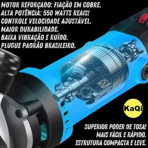 Tosquiadeira Máquina Tosa 550W Kit Lâminas Ovelha Carneiro Ovino 220v KaQi 6576 Tosquiadeira Elétrica Máquina de Tosa Potência Real de 550 Watts Ajuste de velocidade 2400 RPM. Jogo de Lâminas Incluso. VOLTAGEM: 220v. Acompanha maleta para transporte, par de carvões extra e kit manutenção. Surpreenda-se com a super Tosquiadeira Máquina de Tosar KaQi SG-6576. Voltagem 220v. Indicada para aparar e cortar pelos de ovelhas, carneiros, ovinos, caprinos, lhamas, alpacas não indicado para cachorros ou cavalos . Equipado com um poderoso motor de 550 Watts de potência real, de alto toruqe, sistema easy-start partida suave , chave seletora on/off, ajustes de níveis de velocidade até 2400 RPM , regulagem de espessura de corte, além de empunhadura ergonômica. Ideal para tornar a operação de tosa mais rápida, prática e fácil no dia a dia. Acompanha duas lâminas universais de corte, sendo uma superior com 4 dentes, e outra inferior com 13 dentes. Suas lâminas de alta qualidade, dureza e resistência, com pontas afiadas e usinadas, evitam ferimentos nos animais durante a tosa. Seu sistema de encaixe de lâminas é universal e pode ser utilizada com a maioria das lâminas de outras marcas do mercado. Conta ainda com botão de regulagem de tensão, o qual permite alterar a espessura do corte. O corpo da tosquiadeira é feito de PVC durável, leve, ergonômico e confortável, com apenas 1,8kg, o que garante que a empunhadura se adapte facilmente ao formato da mão para uma operação ágil e segura no corte da lã. Para maior comodidade e praticidade, conta com ajuste de velocidades, de 0 a 2400 RPM. Em geral, as velocidades até o nível 3 ou 4 são usadas para o pescoço e pernas dos animais. Já as velocidades na escala de 4 a 6 são adequadas para as costas, abdômen e quadris. Uma inovação nos modelos 6576 KaQi são as aberturas de ventilação que visam maior resfriamento durante a operação prolongada. Ao todo, são 4 pontos de saída de ar, sendo que 2 deles, com filtro embutido para evitar entrada de lã no motor. Segue com uma maleta para transporte e para organização do equipamento, além de kit ferramenta chave de fenda, bisnaga para lubrificantes e óleos, par de carvões extra, pincel para limpeza e manual de instruções. Uma tesoura elétrica única, com design, acabamento e materiais superiores Para funcionamento é necessário conectar à rede elétrica. Atinge aproximadamente 85 decibéis dB de ruído, o que não causa transtorno aos animais. Recomendada para aparar de 5 a 10 ovelhas por hora, o que é adequado para fazendas ou ranchos familiares. Uso de óleos, sprays de resfriamento, também podem ser utilizados durante a tosa, podendo aumentar a capacidade de corte. Conteúdo da embalagem: 1 Tosquiadeira Elétrica Pro 220v KaQi 6576. 1 maleta de transporte. 2 escovas de carvão já instaladas. 2 escovas de carvão sobressalentes. 1 frasco para óleo. 1 escova de limpeza. 1 chave de fenda. 1 manual de instruções. Especificações: Voltagem: 220v. Motor Potência Real: 550 Watts. Velocidade Ajustável: 0 a 2400 RPM. Cabeça da Tosquiadeira: Liga de Alumínio. Corpo da Tosquiadeira: PVC. Plugue: tomada padrão brasileiro 2 pinos 10A . Cabo elétrico: 3,80m. Frequência: 60Hz. Medida da Tosquiadeira: 34 x 9 x 7cm. Peso da Tosquiadeira: 1,8kg. Tamanho da maleta: 44 x 19 x 10cm. Peso total: 2,8kg. : 3 Meses. EAN: 7898692941044 Marca: KaQi. Sempre utilizar equipamentos de EPI para maior segurança.
