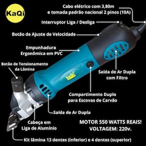 Tosquiadeira Máquina Tosa 550W Kit Lâminas Ovelha Carneiro Ovino 220v KaQi 6576 Tosquiadeira Elétrica Máquina de Tosa Potência Real de 550 Watts Ajuste de velocidade 2400 RPM. Jogo de Lâminas Incluso. VOLTAGEM: 220v. Acompanha maleta para transporte, par de carvões extra e kit manutenção. Surpreenda-se com a super Tosquiadeira Máquina de Tosar KaQi SG-6576. Voltagem 220v. Indicada para aparar e cortar pelos de ovelhas, carneiros, ovinos, caprinos, lhamas, alpacas não indicado para cachorros ou cavalos . Equipado com um poderoso motor de 550 Watts de potência real, de alto toruqe, sistema easy-start partida suave , chave seletora on/off, ajustes de níveis de velocidade até 2400 RPM , regulagem de espessura de corte, além de empunhadura ergonômica. Ideal para tornar a operação de tosa mais rápida, prática e fácil no dia a dia. Acompanha duas lâminas universais de corte, sendo uma superior com 4 dentes, e outra inferior com 13 dentes. Suas lâminas de alta qualidade, dureza e resistência, com pontas afiadas e usinadas, evitam ferimentos nos animais durante a tosa. Seu sistema de encaixe de lâminas é universal e pode ser utilizada com a maioria das lâminas de outras marcas do mercado. Conta ainda com botão de regulagem de tensão, o qual permite alterar a espessura do corte. O corpo da tosquiadeira é feito de PVC durável, leve, ergonômico e confortável, com apenas 1,8kg, o que garante que a empunhadura se adapte facilmente ao formato da mão para uma operação ágil e segura no corte da lã. Para maior comodidade e praticidade, conta com ajuste de velocidades, de 0 a 2400 RPM. Em geral, as velocidades até o nível 3 ou 4 são usadas para o pescoço e pernas dos animais. Já as velocidades na escala de 4 a 6 são adequadas para as costas, abdômen e quadris. Uma inovação nos modelos 6576 KaQi são as aberturas de ventilação que visam maior resfriamento durante a operação prolongada. Ao todo, são 4 pontos de saída de ar, sendo que 2 deles, com filtro embutido para evitar entrada de lã no motor. Segue com uma maleta para transporte e para organização do equipamento, além de kit ferramenta chave de fenda, bisnaga para lubrificantes e óleos, par de carvões extra, pincel para limpeza e manual de instruções. Uma tesoura elétrica única, com design, acabamento e materiais superiores Para funcionamento é necessário conectar à rede elétrica. Atinge aproximadamente 85 decibéis dB de ruído, o que não causa transtorno aos animais. Recomendada para aparar de 5 a 10 ovelhas por hora, o que é adequado para fazendas ou ranchos familiares. Uso de óleos, sprays de resfriamento, também podem ser utilizados durante a tosa, podendo aumentar a capacidade de corte. Conteúdo da embalagem: 1 Tosquiadeira Elétrica Pro 220v KaQi 6576. 1 maleta de transporte. 2 escovas de carvão já instaladas. 2 escovas de carvão sobressalentes. 1 frasco para óleo. 1 escova de limpeza. 1 chave de fenda. 1 manual de instruções. Especificações: Voltagem: 220v. Motor Potência Real: 550 Watts. Velocidade Ajustável: 0 a 2400 RPM. Cabeça da Tosquiadeira: Liga de Alumínio. Corpo da Tosquiadeira: PVC. Plugue: tomada padrão brasileiro 2 pinos 10A . Cabo elétrico: 3,80m. Frequência: 60Hz. Medida da Tosquiadeira: 34 x 9 x 7cm. Peso da Tosquiadeira: 1,8kg. Tamanho da maleta: 44 x 19 x 10cm. Peso total: 2,8kg. : 3 Meses. EAN: 7898692941044 Marca: KaQi. Sempre utilizar equipamentos de EPI para maior segurança.