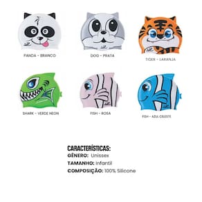 Material de Alta Qualidade: Produzida em 100% silicone, garantindo que a touca seja extremamente resistente, durável e macia ao toque.Proteção Completa: Cria uma barreira eficaz contra a ação do cloro e outros agentes químicos da piscina, protegendo a saúde dos fios e do couro cabeludo sensível das crianças.Conforto Absoluto: Sua elasticidade superior permite um ajuste perfeito sem apertar excessivamente a cabeça, facilitando a colocação e a retirada sem puxar os cabelos.Design Ergonômico: Molda-se suavemente ao formato da cabeça da criança, reduzindo a resistência na água e mantendo a touca firme durante os exercícios.Variedade de Personagens: Disponível em temas divertidos como Tubarão Verde, Tigre Laranja, Panda Branco, Peixinho Rosa, Cachorrinho Prata e Peixinho Azul Celeste e Rosa.Este modelo é um dos favoritos entre pais e professores, pois o visual atraente ajuda a incentivar a prática esportiva regular e aumenta a confiança dos pequenos na água.