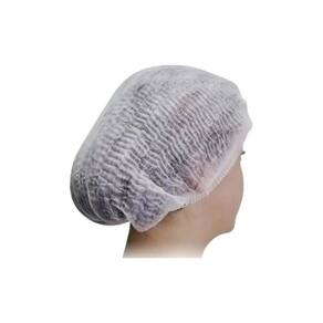 Touca sanfonada branca descartável confeccionada em TNT de estrutura flexível, plana e porosa, por processo automatizado. 100% polipropileno. Atóxico. Embalagem com 100 unidades.