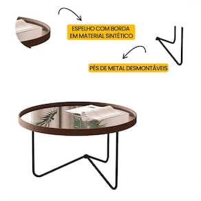 Seu tampo espelhado de 4 mm reflete elegância, enquanto as bordas em material sintético e os pés metálicos garantem resistência e leveza visual.