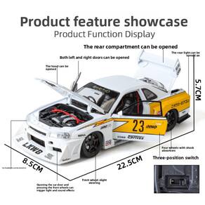 Material: liga de zinco, plástico ABS, borracha Cor: branca Tamanho da embalagem: 22,5 x 8,5 x 5,7 cm Peso da embalagem: 0,405 kg Lista de embalagem: 1 x Toy Car Design realista em escala 1:24: este modelo de carro esportivo modificado pela JDM é feito com muita atenção aos detalhes, com uma cor branca elegante e elementos realistas que o tornam um ótimo item de coleção ou presente para meninos e entusiastas de carros. Características de som e luz: Equipado com efeitos de som e luz, este modelo de carro adiciona um elemento emocionante e interativo ao jogo, tornando-o ainda mais divertido para crianças e colecionadores se divertirem durante a brincadeira ou exibição. Ação movida por fricção: sem necessidade de baterias — basta empurrar o carro e vê-lo girar sem esforço com rodas movidas a fricção, incentivando brincadeiras ativas e diversão criativa para as crianças. Construção robusta: feito de liga de zinco durável, plástico ABS e borracha, este carrinho de brinquedo foi construído para durar, resistindo às brincadeiras e mantendo seu acabamento branco brilhante e detalhes realistas ao longo do tempo. Tamanho perfeito para exibir e jogar: Medindo 22,5 x 8,5 x 5,7 cm e pesando 405 g, este carro tem o tamanho perfeito para ser exibido em mesas ou prateleiras e é fácil de manusear para crianças durante brincadeiras interativas.