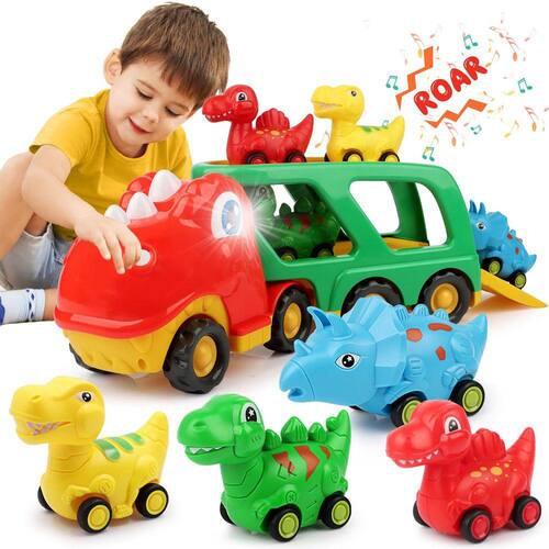 ?Tamanho perfeito para mãos pequenas de crianças?Este conjunto de brinquedos coloridos para carros de dinossauro foi projetado em tamanho científico, mais adequado para mãos pequenas de crianças de 2 a 5 anos. Brinquedos ideais para um menino de 2 anos. Caminhão dinossauro colorido 5 em 1, incluindo um grande transportador e quatro pequenos carros dinossauros. Esses carros pequenos têm o tamanho perfeito para as crianças segurarem e empurrarem. Muito útil para transportar onde quer que você vá. Brinquedos infantis ideais para meninos de 2 a 4 anos.