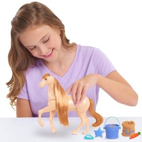 Spirit Riding Free Sounds and Action Horse Feed Set, mistério, brinquedos infantis para crianças a partir de 3 anos Just Play - Possui sons e movimentos realistas de cavalo. - Pet Mystery e ele realmente responderá ao seu toque. - Pressione o botão para que Mystery carimbe sua perna frontal. - Coloque o mistério na parte traseira das patas traseiras como um cavalo de verdade. - Possui crina enraizada para escovar e pentear. - Vem com cinco acessórios: um acessório de cabelo, uma escova de higiene, um saco de ração, um balde de ração e uma cenoura. - A partir de 3 anos