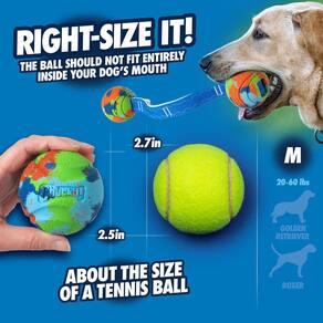 - Tamanho importante: o tamanho médio mede 6,3 cm de diâmetro e é mais adequado para cães com peso de 9 a 27 kg. A bola deve ser pequena o suficiente para o seu cão carregar, mas grande o suficiente para que a bola não caiba completamente em sua boca; em caso de dúvida, compre um tamanho maior!