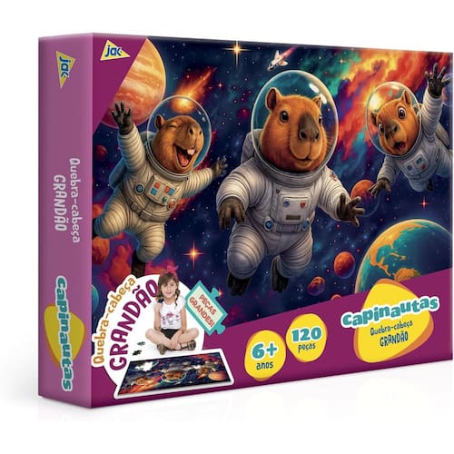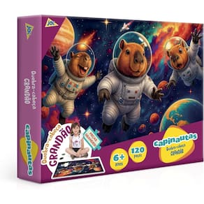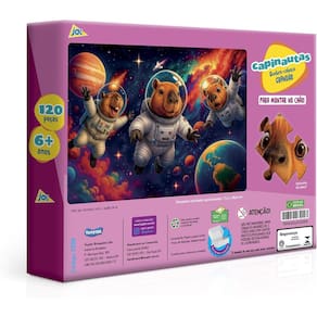 As capivaras viraram astronautas e estão explorando o espaço sideral! Com 120 peças grandes, é perfeito para crianças a partir de 6 anos. Uma aventura divertida que estimula a imaginação, a coordenação motora e o raciocínio lógico! TAMANHO DO QUEBRA-CABEÇAS MONTADO 71,2 X 49,6