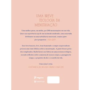 UMA BREVE TEOLOGIA DA MENSTRUAÇÃO Uma mulher passa, em média, por 500 menstruações em sua vida. Quer sua experiência seja de um incômodo moderado, uma enxurrada debilitante ou uma turbulência emocional, a maior parte já se perguntou: Por quê?! Este livro honesto, leve, bem-humorado e sempre surpreendente procura uma visão bíbilica sobre a menstruação. A partir desses períodos complicados, Rachel Jones nos lidera em uma aventura teológica, tecendo reflexões sobre a natureza de nossos corpos, a passagem do tempo, o propósito da dor e o sentido da vida. Uma coisa é certa: você nunca leu um livro cristão como este.