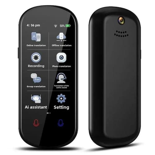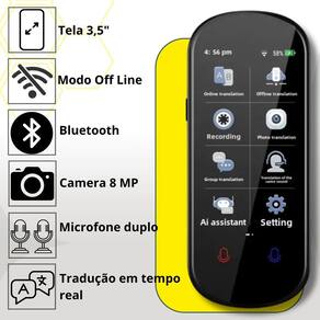 Idiomas suportados: 138 (com 12 em offline) Velocidade de tradução: 0,1?s Tela: Touchscreen IPS de 3,5? Câmera: 8?MP para tradução visual Microfone: Duplo com cancelamento de ruído Bateria: 1500?mAh – até 8?h de uso contínuo e até 168?h standby Conectividade: Wi-Fi, Bluetooth, hotspot