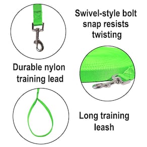 - Coleira de treinamento de nylon – Esta coleira de treinamento de cães durável, longa e de nylon durará mais que as coleiras de algodão. Todas as costuras são reforçadas e o clipe niquelado gira para resistir à torção. Nossa coleira longa para cães é ótima para cães de médio e grande porte. Você vai adorar usá-la como uma coleira de cachorro no quintal, para treinamento de cães sem coleira e muito mais.