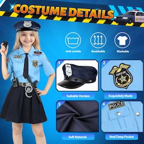 -?Design requintado de bordado de roupas?Nossas fantasias de policial infantil são feitas de poliéster, que é macio, respirável e não machuca a pele das meninas. Bordados requintados, chapéus policiais realistas e acessórios policiais farão de seu filho o foco da multidão! O traje inteiro pode ser lavado e você não precisa mais se preocupar com o fato de seu filho fazer bagunça ao brincar ao ar livre. Ao usá-lo, as meninas também podem ser pequenas policiais corajosas.