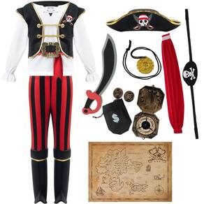 Fantasia de pirata infantil Spooktacular Creations, vestido pirata para meninos, festa temática de Halloween e pacote super econômico Role Play-S: este conjunto de fantasia infantil de pirata inclui 1 blusa, 1 par de calças com capas de botas, 1 cinto, 1 chapéu, 1 espada de brinquedo, 1 bandana, 1 tapa-olho, 1 bolsa de moedas com 6 moedas, 1 bússola de brinquedo, 1 mapa e 1 colar. Qualidade: feita de 100% poliéster e aprovado pelo teste de segurança, este conjunto é confortável, durável e feito para durar. Se você está comendo doces ou travessuras, participando de uma festa à fantasia ou subindo ao palco para uma apresentação, nosso conjunto de fantasias de pirata oferece várias ocasiões especiais: ideal para fantasias de Halloween, festas à fantasia, festas temáticas, apresentações teatrais e dramatizações, essa fantasia de pirata certamente será um sucesso e perfeita para qualquer ocasião. Com seu design pirata clássico e atenção aos detalhes, você parecerá um verdadeiro capitão do Caribe. Instruções de cuidado: Para manter sua roupa limpa e fresca, recomendamos limpar com esponja ou lavar as mãos. Não clareie, seque na secadora ou passe a ferro . Ajuste perfeito: nossa fantasia de pirata foi projetada para crianças e está disponível em três tamanhos (criança (3 a 4 anos), pequena (5 a 7 anos) e média (8 a 10 anos)), adequada para crianças de diferentes idades e garante um ótimo ajuste — Pacote super econômico: este conjunto de fantasia infantil de pirata inclui 1 blusa e 1 par de calças com capas para botas, 1 cinto, 1 chapéu, 1 espada de brinquedo, 1 bandana, 1 tapa-olho, 1 bolsa de moedas com 6 moedas, 1 bússola de brinquedo, 1 mapa e 1 colar. - Qualidade: Feito de 100% poliéster e aprovado pelo teste de segurança, este conjunto é confortável, durável e feito para durar. Se você está comendo doces ou travessuras, participando de uma festa à fantasia ou subindo ao palco para uma apresentação, nosso conjunto de fantasias de pirata tem tudo para você. - Ocasiões especiais: ideal para fantasias de Halloween, festas à fantasia, festas temáticas, apresentações teatrais e dramatizações, essa fantasia de pirata certamente será um sucesso e perfeita para qualquer ocasião. Com seu design clássico de pirata e atenção aos detalhes, você parecerá um verdadeiro capitão do Caribe. - Instruções de cuidado: Para manter sua roupa limpa e fresca, recomendamos limpar com esponja ou lavar as mãos. Não clareie, não seque na secadora nem passe a ferro. - Ajuste perfeito: nossa fantasia de pirata foi projetada para crianças e está disponível em quatro tamanhos (criança (3 a 4 anos), pequena (5 a 7 anos), média (8 a 10 anos) e grande (10 a 12 anos)), adequada para crianças de diferentes idades e garante um ótimo ajuste.
