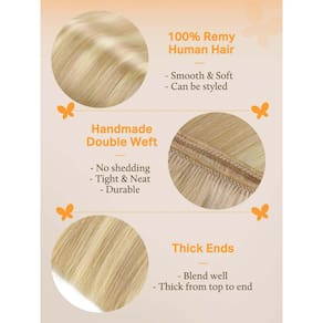 - ?Extensões de cabelo humano costuradas em trama naturais, macias e duráveis? Feito de 100% cabelo humano Remy, aparência sedosa natural e toque macio, brilho natural, sem emaranhamento, sem queda, cheio de cima a ponta, misture bem com seu próprio cabelo. As extensões de cabelo costuradas em trama usam o processo de trama dupla, para que as extensões de cabelo de trama não caiam facilmente e durem mais tempo.