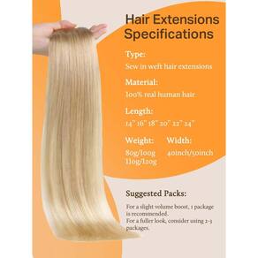 2. Especificações das extensões de cabelo: 14/40.6 cm: 80/100 g (pacote), 45.7-61.0 cm: 100 g/pacote.