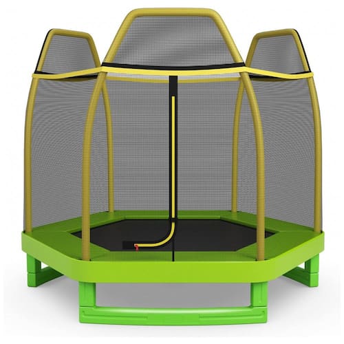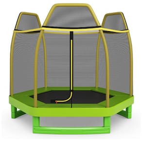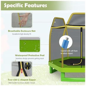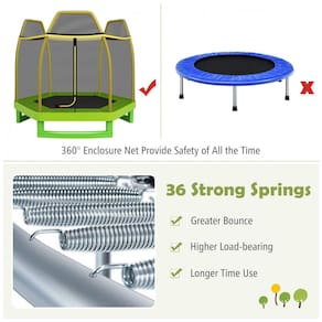 Descrição Este trampolim redondo de segurança ajudará os seus filhos a melhorar as suas capacidades de salto, ao mesmo tempo que promove o seu metabolismo corporal e melhora a sua imunidade. É caracterizado por uma forte estrutura de aço galvanizado e base triangular para aumentar a estabilidade, e a cerca de segurança está firmemente conectada à plataforma de salto para eliminar lacunas perigosas e proteger os pés do bebê contra lesões. A capa protetora de espuma EPE evita que seu filho colida acidentalmente ao pular livremente. Nosso trampolim é o presente perfeito para as crianças. Características Há uma rede protetora externa para proteger seu filho ao pular Rede protetora externa com zíper em forma de L, centro de atividades em grande escala Força de mola forte, grande força de tração, sem deformação A rede de segurança fortalece o amortecedor e tem forte resistência ao impacto Almofada de plataforma PP, desgaste capa protetora de espuma EPE resistente e de boa resiliência para evitar choques acidentais Pano Oxford acolchoado não belisca os pés do bebê Promove aumento de altura, melhora o efeito físico Especificações Material Aço galvanizado, PP, EPE Dimensão total 7,3 pés x 7,3 pés x 6,1 pés C x L x A Peso líquido 55 libras Capacidade de peso 220 libras O pacote inclui 1 x trampolim 1 x manual do usuário Rede de gabinete respirável Zíper em forma de L O trampolim infantil está equipado com uma rede de gabinete respirável. Ele não apenas mantém seu filho , mas também ajuda você a ficar de olho nos movimentos do seu filho. O zíper em forma de L tem um fecho aderente que é mais do que o zíper comum e pode garantir um melhor fechamento quando eles brincam. Trampolim de segurança para crianças O design perfeito entre a cerca e a almofada, para que seu filho não fique preso no vão. O protetor de espuma EPE evita que seu filho bata acidentalmente ao pular livremente. E o grande tapete de plataforma circular de 83 polegadas de diâmetro oferece espaço suficiente para as crianças. Estrutura galvanizada resistente Este trampolim infantil de 7 pés é composto por uma estrutura de aço galvanizado e uma base triangular reforçada. Ele pode suportar um peso de 220 libras e evitar efetivamente que escorregue ao pular da plataforma. Longa vida útil Anexado com mola espessa anti ferrugem, alta elasticidade, sem deformação, para garantir o uso a longo prazo. A almofada da plataforma de salto é confeccionada em material PP, com elasticidade de alta qualidade, permitindo que as crianças pulem mais alto e mais felizes. Presente perfeito para crianças. Dimensão geral 7,3 pés x 7,3 pés x 6,1 pés C x L x A. Este trampolim recreativo será um destaque atraente para o seu quintal e servirá como um centro de atividades ao ar livre para o seu tempo semanal de diversão em família, garantindo que seus filhos e amigos caiam na gargalhada todos os dias. O presente perfeito para crianças