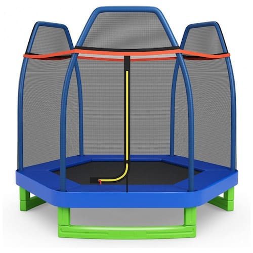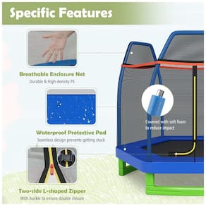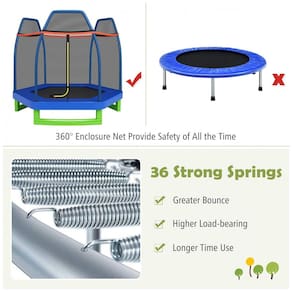 Descrição Este trampolim redondo de segurança ajudará os seus filhos a melhorar as suas capacidades de salto, ao mesmo tempo que promove o seu metabolismo corporal e melhora a sua imunidade. É caracterizado por uma forte estrutura de aço galvanizado e base triangular para aumentar a estabilidade, e a cerca de segurança está firmemente conectada à plataforma de salto para eliminar lacunas perigosas e proteger os pés do bebê contra lesões. A capa protetora de espuma EPE evita que seu filho colida acidentalmente ao pular livremente. Nosso trampolim é o presente perfeito para as crianças. Características Há uma rede protetora externa para proteger seu filho ao pular Rede protetora externa com zíper em forma de L, centro de atividades em grande escala Força de mola forte, grande força de tração, sem deformação A rede de segurança fortalece o amortecedor e tem forte resistência ao impacto Almofada de plataforma PP, desgaste capa protetora de espuma EPE resistente e de boa resiliência para evitar choques acidentais Pano Oxford acolchoado não belisca os pés do bebê Promove aumento de altura, melhora o efeito físico Especificações Material Aço galvanizado, PP, EPE Dimensão total 7,3 pés x 7,3 pés x 6,1 pés C x L x A Peso líquido 55 libras Capacidade de peso 220 libras O pacote inclui 1 x trampolim 1 x manual do usuário Rede de gabinete respirável Zíper em forma de L O trampolim infantil está equipado com uma rede de gabinete respirável. Ele não apenas mantém seu filho , mas também ajuda você a ficar de olho nos movimentos do seu filho. O zíper em forma de L tem um fecho aderente que é mais do que o zíper comum e pode garantir um melhor fechamento quando eles brincam. Trampolim de segurança para crianças O design perfeito entre a cerca e a almofada, para que seu filho não fique preso no vão. O protetor de espuma EPE evita que seu filho bata acidentalmente ao pular livremente. E o grande tapete de plataforma circular de 83 polegadas de diâmetro oferece espaço suficiente para as crianças. Estrutura galvanizada resistente Este trampolim infantil de 7 pés é composto por uma estrutura de aço galvanizado e uma base triangular reforçada. Ele pode suportar um peso de 220 libras e evitar efetivamente que escorregue ao pular da plataforma. Longa vida útil Anexado com mola espessa anti ferrugem, alta elasticidade, sem deformação, para garantir o uso a longo prazo. A almofada da plataforma de salto é confeccionada em material PP, com elasticidade de alta qualidade, permitindo que as crianças pulem mais alto e mais felizes. Presente perfeito para crianças. Dimensão geral 7,3 pés x 7,3 pés x 6,1 pés C x L x A. Este trampolim recreativo será um destaque atraente para o seu quintal e servirá como um centro de atividades ao ar livre para o seu tempo semanal de diversão em família, garantindo que seus filhos e amigos caiam na gargalhada todos os dias. O presente perfeito para crianças