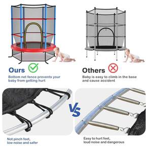 Estrutura acolchoada protetora Com rede de segurança completa, o trampolim infantil lhe dará a confiança necessária para deixar seu filho pular em paz. E o tubo de espuma pode proteger seu filho de lesões, garantindo a segurança total de seus filhos pequenos. Perfeito para exercícios infantis A rede do gabinete tem uma porta com zíper para as crianças entrarem e saírem. Com seu design transparente, você pode ficar de olho em seus filhos enquanto faz outras coisas. A rede inferior também mantém os seus filhos afastados do espaço. Enquanto isso, as pernas estendidas podem aumentar a estabilidade e evitar tombamento para garantir segurança extra. Construção estável e durável Feito de tubo de aço galvanizado no interior, o trampolim infantil é sólido e estável o suficiente para suportar até 300 libras. E a superfície galvanizada é resistente à ferrugem, aumentando a resistência, o que é de grande durabilidade com longo tempo de serviço. Fácil de montar Nosso trampolim infantil é equipado com 30 cordas de tensão, que tem boa elasticidade, permitindo que as crianças pulem mais alto. Enquanto isso, as cordas de tensão não são fáceis de deformar para uso a longo prazo e facilitam a instalação. Com um peso líquido de apenas 24 libras, o trampolim pode ser facilmente movido para onde você quiser. Construído com detalhes atenciosos O tapete de salto em PP antiderrapante e resistente ao desgaste e a almofada de segurança em PVC podem fornecer excelente desempenho de salto, o que faz com que seu filho se sinta um exercício emocionante e divertido. E também pode ajudar seu filho a desenvolver um senso de coragem e melhorar as habilidades de equilíbrio, o que é especialmente benéfico para seu filho