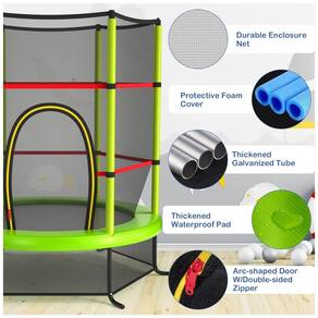 Estrutura acolchoada protetora Com rede de segurança completa, o trampolim infantil lhe dará a confiança necessária para deixar seu filho pular em paz. E o tubo de espuma pode proteger seu filho de lesões, garantindo a segurança total de seus filhos pequenos. Perfeito para exercícios infantis A rede do gabinete tem uma porta com zíper para as crianças entrarem e saírem. Com seu design transparente, você pode ficar de olho em seus filhos enquanto faz outras coisas. A rede inferior também mantém os seus filhos afastados do espaço. Enquanto isso, as pernas estendidas podem aumentar a estabilidade e evitar tombamento para garantir segurança extra. Construção estável e durável Feito de tubo de aço galvanizado no interior, o trampolim infantil é sólido e estável o suficiente para suportar até 300 libras. E a superfície galvanizada é resistente à ferrugem, aumentando a resistência, o que é de grande durabilidade com longo tempo de serviço. Fácil de montar Nosso trampolim infantil é equipado com 30 cordas de tensão, que tem boa elasticidade, permitindo que as crianças pulem mais alto. Enquanto isso, as cordas de tensão não são fáceis de deformar para uso a longo prazo e facilitam a instalação. Com um peso líquido de apenas 24 libras, o trampolim pode ser facilmente movido para onde você quiser. Construído com detalhes atenciosos O tapete de salto em PP antiderrapante e resistente ao desgaste e a almofada de segurança em PVC podem fornecer excelente desempenho de salto, o que faz com que seu filho se sinta um exercício emocionante e divertido. E também pode ajudar seu filho a desenvolver um senso de coragem e melhorar as habilidades de equilíbrio, o que é especialmente benéfico para seu filho