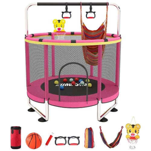 A mola de tambor de cintura grossa é personalizada e duradoura sem deformação, proporcionando segurança para as crianças em ambientes internos e externos. O trampolim é fácil de montar e inclui acessórios gratuitos, como argolas, balanços, sacos de areia, bolas oceânicas e cestos, para proporcionar mais diversão para seus filhos enquanto saltam.