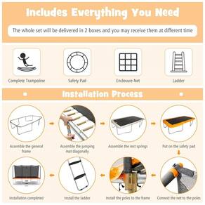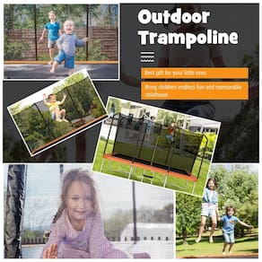 A segurança sempre vem em primeiro lugar O trampolim Goplus foi testado quanto à segurança e está em conformidade com o padrão ASTM. Temos um design único que deixa espaço suficiente entre o mastro do trampolim e a rede do recinto para evitar que as crianças colidam ao cair. Além disso, não há espaço entre a rede e o tapete de salto, o que minimiza o risco de cortar os pés durante o salto. Rede de proteção completa de 6 pés de altura O trampolim é envolto por uma rede de segurança de 6 pés de altura a 360 graus, para que seus filhos possam pular como quiserem ao ar livre. A rede protetora bem tecida é feita de material de poliéster de alta qualidade, que é à prova de UV, desbotamento e rasgo. A rede protetora é firmemente fixada ao poste com parafusos em vez de tiras simples, o que a torna mais durável em tempo de vento. Estrutura estável de aço galvanizado por imersão a quente. O trampolim retangular de 8 pés x 14 pés é construído com tubos de aço galvanizado por imersão a quente que também aplicam tecnologia de galvanização de dupla face para maior resistência ao desgaste e à ferrugem. Além disso, possui 4 pernas em forma de U com pés antiderrapantes e uma escada com degraus antiderrapantes para uma estrutura mais estável e uma experiência de usuário mais segura. Experiência de salto de alta qualidade O trampolim inclui 84 molas resistentes, apertando o tapete de salto e a estrutura para um rebote rápido. O tapete de salto PP é resistente a rasgos, respirável e 5.000 horas de proteção solar, e pode ser por muito tempo ao ar livre. Este trampolim sem abertura vem com uma almofada de segurança espessa e à prova dágua para cobrir as molas. Bounce for Happiness and Fitness Nosso trampolim ao ar livre será um presente ideal para seus filhos, trazendo diversão sem fim e uma infância memorável. As crianças podem fortalecer a aptidão física, r o crescimento corporal e exercitar a capacidade de equilíbrio enquanto saltam. Além disso, o trampolim é equipado com zíper duplo e fivela de travamento, permitindo que as crianças entrem e saiam com mais rapidez e facilidade. Conectores Exclusivos Fácil Montagem A montagem é fácil com instruções passo a passo e ferramentas de instalação incluídas. Além disso, temos um design de conexão exclusivo que permite instalar o poste diretamente na base, sem ter que lutar com vários parafusos. Observe que todo o conjunto será entregue em 2 caixas e você poderá recebê las em momentos diferentes