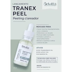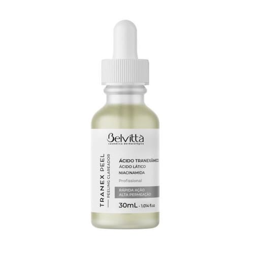 Tranex Peel Peeling Clareador 30ml - Belvittà - Descrição: O Tranex Peel Peeling é um peeling com eficácia prolongada no clareamento e prevenção de manchas de hiperpigmentação, especialmente o melasma. Sua associação exclusiva dos ácidos lático e tranexâmico com a niacinamida promove ação esfoliante, renovando rapidamente a epiderme, minimiza manchas causadas pelo sol, uniformiza o tom da pele, melhora a textura, aumenta o viço e a luminosidade da pele. Ativos: Ácido Tranexamico 5%: Previne a pigmentação da pele induzida pela radição UV do sol, reduz a ativação de mediadores inflamatórios que estimulam a produção de melanina, controlando a hiperpigmentação da pele, clareia, evita a formaçao de novas manchas e uniformiza a tonalidade da pele. Ácido Lático 10%: Considerado um dos ácidos mais seguros e eficazes, promove esfoliação e renovação da pele, suprime a atividade da enzima tirosinase, prevenindo a formação e atenuando manchas de hiperpigmentação, como o melasma, além de melhorar a textura e uniformizar a cor da pele. Niacinamida 5%: Inibe a transferência de melanina para as camadas mais externas, reduzindo a hiperpigmentação da pele, previne e clareia manchas, reduz diferenças de tonalidade e uniformiza a coloração da pele. Modo de Uso: Aplicar uniformemente sobre a pele limpa e seca. Enxaguar até a remoção total. Características Gerais do Produto: Acompanha o produto: 1 Tranex Peel Peeling Clareador 30ml - Belvittà : Contra Defeito de Fabricação Marca: Não Informado Ean: 7898943160393