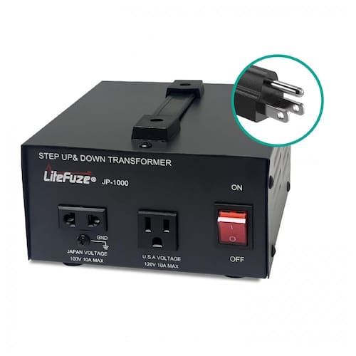 O transformador LiteFuze JP-1000 de 1000W converte voltagem entre padrões japonês 100V e americano 120V, operando como step-up (100V para 120V) para aparelhos japoneses em redes de 120V ou step-down (120V para 100V) para equipamentos de 120V em redes de 100V. Tecnologia ConvertingBox otimiza eficiência da conversão, reduzindo peso e ruído operacional em comparação a transformadores convencionais.