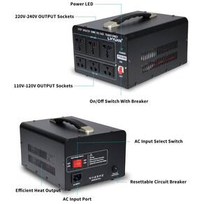 O transformador conversor de voltagem LVYUAN 3000W LY-VT-3000VA executa conversão step up de 110-120V para 220-240V e step down de 220-240V para 110-120V, suportando carga máxima de 3000W. Oferece saídas simultâneas com 3 tomadas US para 110-120V e 3 tomadas universais para 220-240V, além de cabo de alimentação destacável para adaptação a padrões internacionais. Design com carcaça metálica preta, resfriamento passivo sem ventilador, operação silenciosa e sem emissões de odor, utilizando componentes ambientalmente corretos.