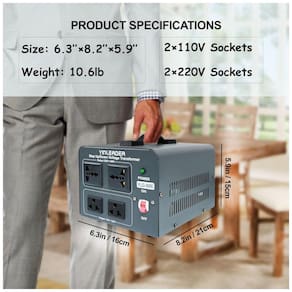 O conversor de voltagem Yinleader 3000W é um transformador step-up/step-down projetado para conversão eficiente de energia elétrica entre padrões 110-120V e 220-240V. Equipado com 2 tomadas US padrão para aparelhos de 110-120V e 2 tomadas universais compatíveis com plugs globais (exceto plugues sul-africanos grandes) para dispositivos de 220-240V, oferece versatilidade para uso internacional.