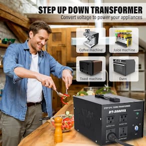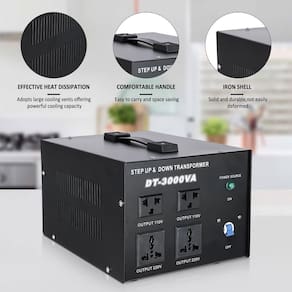 Características: O transformador de tensão oferece a você uma solução segura, confiável, acessível e conveniente para converter tensões de 110-120 volts até 220-240 volts ou de 220-240 volts para 110-120 volts para uso doméstico e aplicações industriais. É avaliado em 3000 watts no máximo. Possui um cabo resistente com um plugue padrão de 3 pinos dos EUA. Há um total de quatro saídas no painel frontal. (Duas saídas de 110 V, duas saídas de 220 V) Duas saídas aterradas de 110 V designadas para 120 volts com uma tomada padrão dos EUA e a tomada universal de 220 volts que aceita plugues da maioria dos países. Ele também possui disjuntores que protegem o equipamento e o transformador contra sobrecarga. Observação: Por segurança, é recomendado pelo fabricante que a potência máxima do transformador de tensão seja igual ou maior do que a potência nominal do seu aparelho multiplicada por 1,5. Por exemplo, se você tiver um aparelho avaliado em 100 watts, precisará escolher um transformador com uma potência máxima de 150 watts ou mais. (Sugere-se que o consumo total de energia das cargas a serem conectadas não exceda 80% da taxa de potência do produto) Tamanho do produto: 260 x 220 x 180 mm (C x L x A) Peso do produto: 9,7 kg - 24 x 7 horas de tempo de trabalho e 100% de capacidade de carga. Transformador de alta eficiência com saída estável e baixo consumo. - O disjuntor doméstico não desativa no momento inicial. - Proteção contra sobrecorrente. Existem 2 mini disjuntores de entrada instalados, uma vez que ocorre uma sobrecorrente ou curto-circuito, o disjuntor irá desligar. - Este conversor de tensão pode ser utilizado em países de 110 volts e países de 220 volts. Ele será convertido de 220v-240v para 110v-120v e de 110v-120v para 220v-240v. - Certificado CE, FCC, RoHS, adequado para dispensador de água, fax com ventilador, máquina de ar, computador, etc.