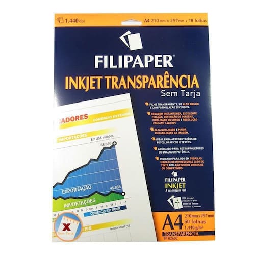 Transparência Jato de Tinta sem Tarja Filipaper 50 folhas A transparência é um filme de Poliéster Transparente de alto brilho com secagem instantânea, excelente fixação da tinta, ótima definição de imagens e fidelidade de cores com uma resolução de até 1.440 DPI. Alta qualidade e Maior durabilidade Adequado para Retroprojetores de qualquer potência Indicado para uso em todas as marcas de impressoras jato de tinta com cartuchos originais ou compatíveis Aplicações para Transparência Jato de Tinta (Ink Jet) A Transparência jato de tinta (Ink Jet) é ideal para apresentações de fotos, Gráficos e Textos utilizando retroprojetores Composição da Transparência Jato de Tinta (Ink Jet) O Filme base utilizado neste produto, possui característica especiais quanto à transparência, brilho e lisura superficial, garantindo a sua imagem real Marca: Filipaper Unidade: Pacote Peso: 0,500 Produto por Embalagem: 50 Folhas Dimensões da caixa (cm): 33x23x2cm Cor: Transparente Material / Modelo: Sem tarja / Jato de tinta Tamanho: A4(210x297mm) Tag: Transparência Jato de Tinta