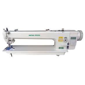 Máquina de costura reta transporte duplo alongada eletrônica com 56cm de base, motor Direct Drive, painel digital, corte de linha e levantamento de calcador automáticos, posicionador de agulha, arremate inicial e final, lançadeira grande, altura de calcador de 12mm, tamanho do ponto de 8mm, velocidade de 5000ppm e lubrificação automática.Funções