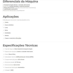 Máquina de costura industrial reta ponto fixo com sistema de transporte duplo, lubrificação automática e levantador de calcador por alavanca e joelheira, com tamanho máximo do ponto de 8mm.Ideal para uso em materiais pesados, como couro, courino, sintético, lona e PVC, devido ao sistema de transporte duplo por dente e calcadores que auxilia no transporte de materiais pesados.