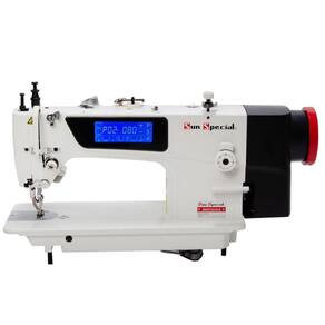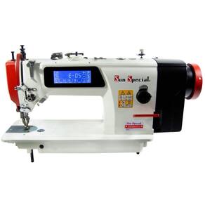Máquina de Costura Industrial Transporte Duplo Direct Drive Sun Special SS0303D4-BAQI com Touch Screen, corte de linha, levantamento de calcador automático e lançadeira grande. Indicada para materiais pesados como couro, lona, sintéticos e vinil. Possui baixo nível de ruído e vibração, função ponto-a-ponto, economia de energia e alívio de fadiga do operador. Funções automáticas incluem levantamento do calcador, posicionamento da agulha, costura programada, função travetinho ou costuras sobrepostas para reforço, corte de linha, limpa fio, velocidade inicial de costura programável, lubrificação automática e arremate inicial e final.Funções