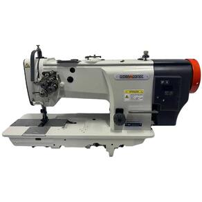 Lançadeira Grande Vertical Máquina Reta 2 Agulhas com ponto fixo, lubrificação automática e transporte triplo por Dente calcador e agulha (evita o franzimento do tecido), indicada para materiais pesados como estofados, couros, lonas, sintéticos entre outros.