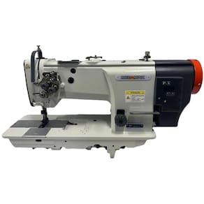 Máquina Reta 2 Agulhas com ponto fixo, lubrificação automática e transporte triplo por Dente calcador e agulha (evita o franzimento do tecido), indicada para materiais pesados como estofados, couros, lonas, sintéticos entre outros.