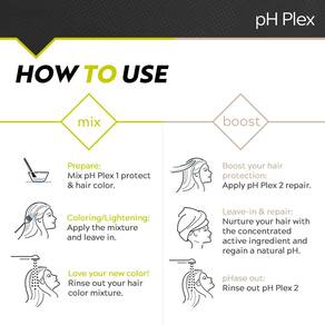 - O pH Plex 1 e 2 é um sistema projetado para ser utilizado com sua coloração de cabelo ou produtos de branqueamento para reparar as ligações 3D dentro do cabelo
