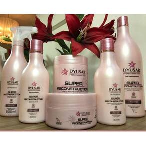 O kit contém: 01 shampoo hidratante dyusar super reconstruction 1 litro 01 máscara hidratante dyusar super reconstruction 1kg 01 queratina cistina líquida dyusar super reconstruction 500ml 01 dador de brilho line angel spray 90ml Shampoo hidratante super reconstruction. O shampoo hidratante limpa os fios, revitalizando e fortificando os cabelos. Modo de usar: aplique sobre os cabelos molhados, massageando bem até formar espuma. Enxágue e se necessário, repita a aplicação. mascara super reconstruction dyusar professional hair. efeito teia. A mascara hidratante é uma máscara capilar que tem efeito teia, promove hidratação profunda, nutrição intensa, maleabilidade, brilho e sedosidade. Modo de usar: apos lavar os cabelos, aplique o produto sobre toda a extensão dos fios. Massageie e deixe agir por aproximadamente 7 minutos. enxágue bem. Queratina cistina em spray. A queratina cistina é um restaurador capilar que confere uma revitalização intensiva da fibra capilar, reduzindo a porosidade hidratando e deixando os cabelos mais resistentes e saudáveis, indicada para cabelos frágeis, desvitalizados ou sensibilizados por processos químicos. Modo de usar: agite antes de usar. Após lavar os cabelos, retire o excesso umidade com a toalha e aplique o produto por toda extensão dos fios. Enluvar e deixar agir por aproximadamente por 10 minutos. Enxaguar. Pode ser como pre escova. Doador de brilho line angel da dyusar professional hair 90ml O doador de brilho line angel da dyusar professional hair é um oléo capilar que doa brilho intenso aos fios enquanto elimina odores do dia a dia. Modo de usar: agite bem antes de usar. A uma distância de 15 a 20 cm dos cabelos, aplique sobre toda a extensão dos fios. Pode ser antes ou após a escova ou prancha. Marca: Não Informado