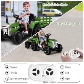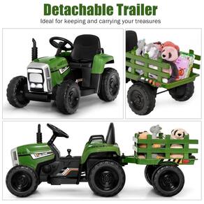O OLAKIDS 12V kid 2 em 1 é um trator com reboque que proporciona aos seus pequenos um prazer de condução superior e verdadeira diversão. O reboque é removível, sólido e durável, e os faróis LED brilhantes e som de inicialização oferecem um estilo realista.