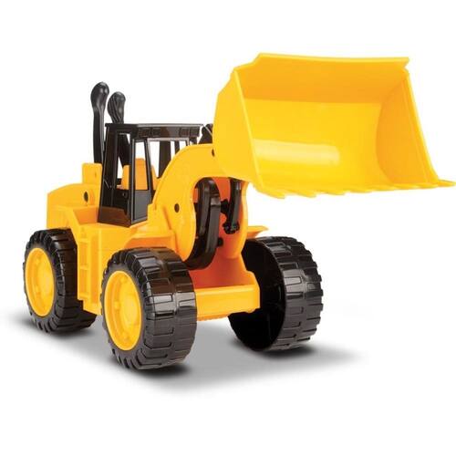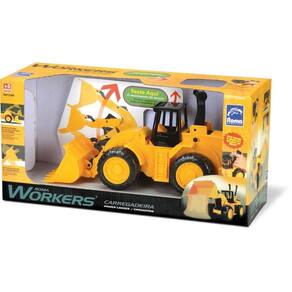 A Roma Workers Carregadeira é articulada, possui duas alavancas para a criança levantar e abaixar o braço de elevação, como também bascular a caçamba.