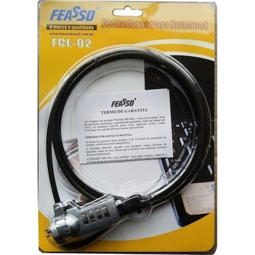 Trava De Segurança para Notebook Trava Com Segredo 1,5 Metros JCL-02 - Produtos Fornecidos com . Confeccionado em aço super resistente. Fácil de usar, basta passar o cabo em algum objeto fixo e prender o cadeado no notebook. Possui Segredo de 4 dígitos que oferece até 10.000 combinações diferentes, a chave só é retirada quando a trava está trancada. Evita a perda da chave. Material - Aço revestido com plástico. Fabricante Marca: Feasso Modelo: FCL-02 : 3 meses Marca: Não Informado