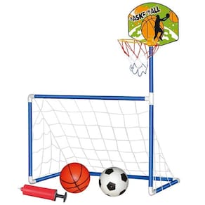 O brinquedo trave 2 em 1 DM Sports é irado! Você pode jogar basquete e futebol! Vem com acessórios, incluindo uma bola de basquete e uma bola de futebol.