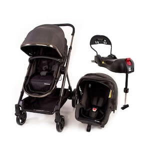 O trio completo: carrinho + bebê conforto + base veicular para cintos e ISOFIX. Estrutura leve de alumínio cromado, função moisés e passeio, capotas com proteção solar UV50+.