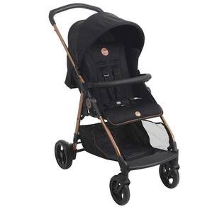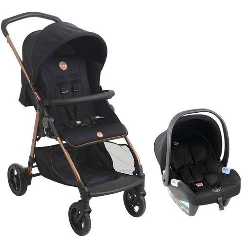 Leve seu bebê a lugares incríveis. O conjunto travel system Lui Preto Cobre é composto pelo carrinho Lui e o bebê conforto materna.