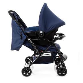 Conjunto de bebê conforto com redutor de assento e carrinho tipo berço, com bandeja frontal removível, alça reversível e freio traseiro centralizado.